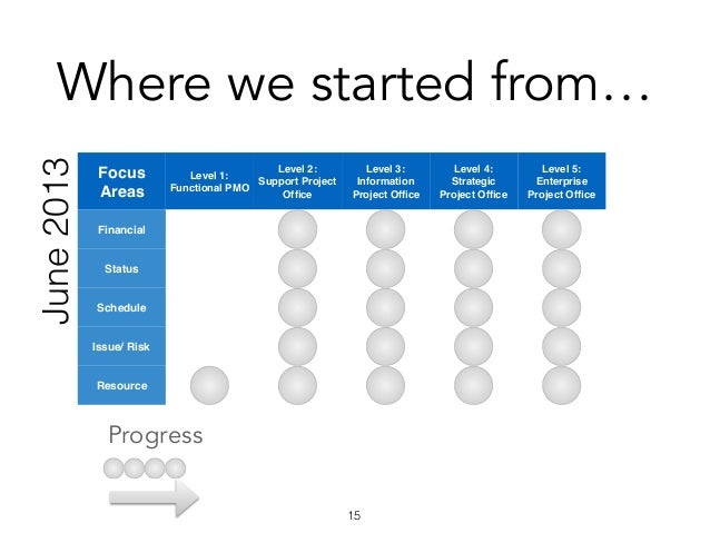 Project health (status) is determined by continuously updated completion percentage compared to the planned value as well as its cost, quality, and schedule variance, in addition to the root cause of any discrepancy. It also includes reporting major risks and issues and corresponding mitigation plans. - Setup a Project Management Office as part of a business transformation.